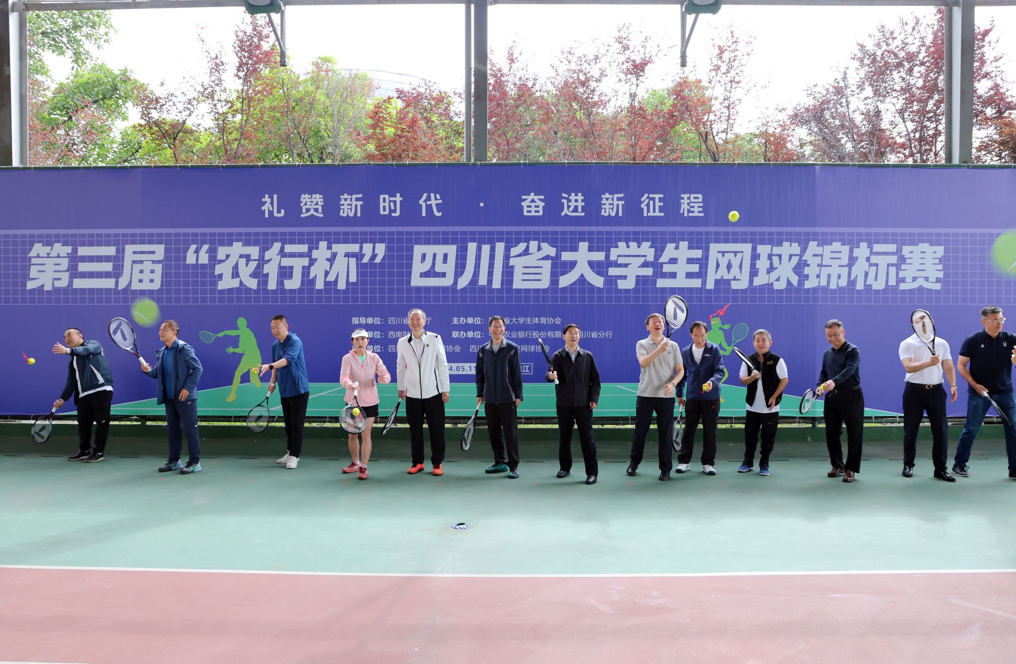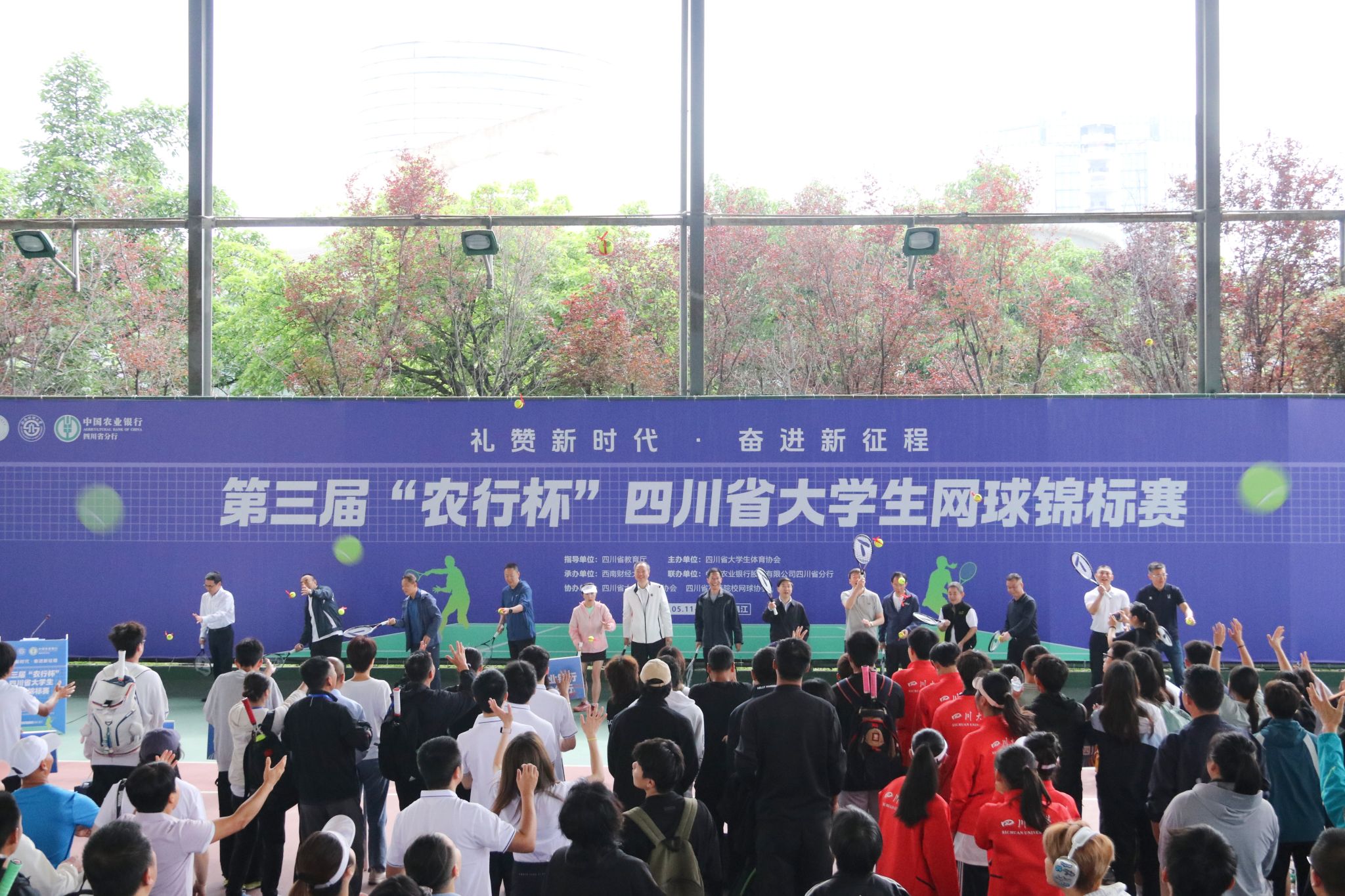 四川省教育廳副廳長石靜,四川省大學生體育協會總顧問、四川省大學生網球協會主席劉青,四川省高等院校網球協會主席賴廷謙,四川省網球協會副主席、新華社四川分社原社長劉欣欣,中國農業銀行股份有限公司四川省分行黨委委員、副行長兼成都分行黨委書記、行長王屹,中國農業銀行股份有限公司四川省分行高級專家兼成都分行黨委委員、副行長朱波,成都市網球協會副主席賀杰,四川省大學生體育協會會長、學校體育學院院長楊遠波,四川省大學生體育協會秘書長、西南交通大學體育學院院長劉江出席開幕式,并為比賽開球。